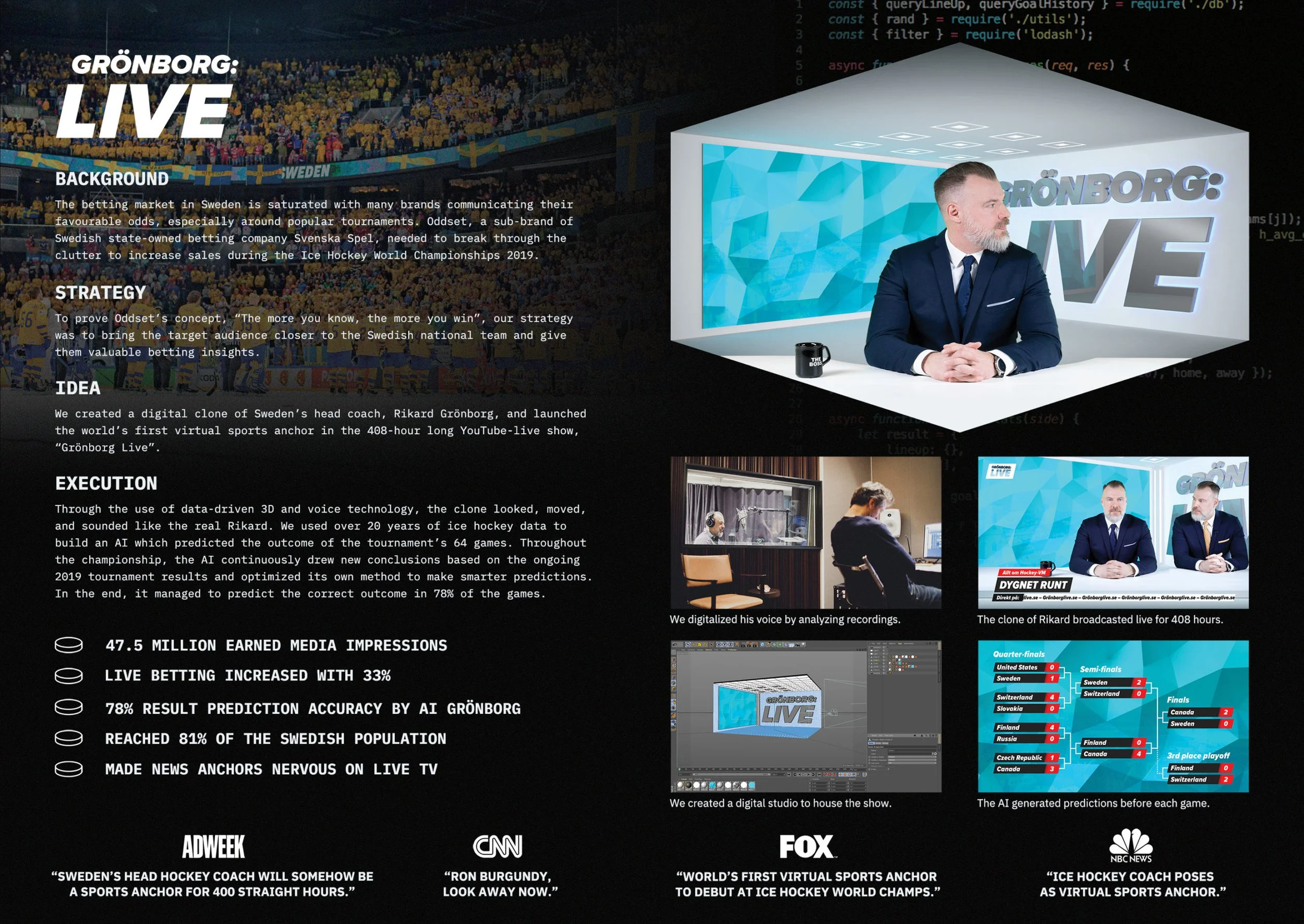 In the YouTube series Grönborg Live, this AI-powered digital anchor hosted a marathon broadcast of 408 hours during the Ice Hockey World Championships, delivering real-time insights, predictions, and commentary.